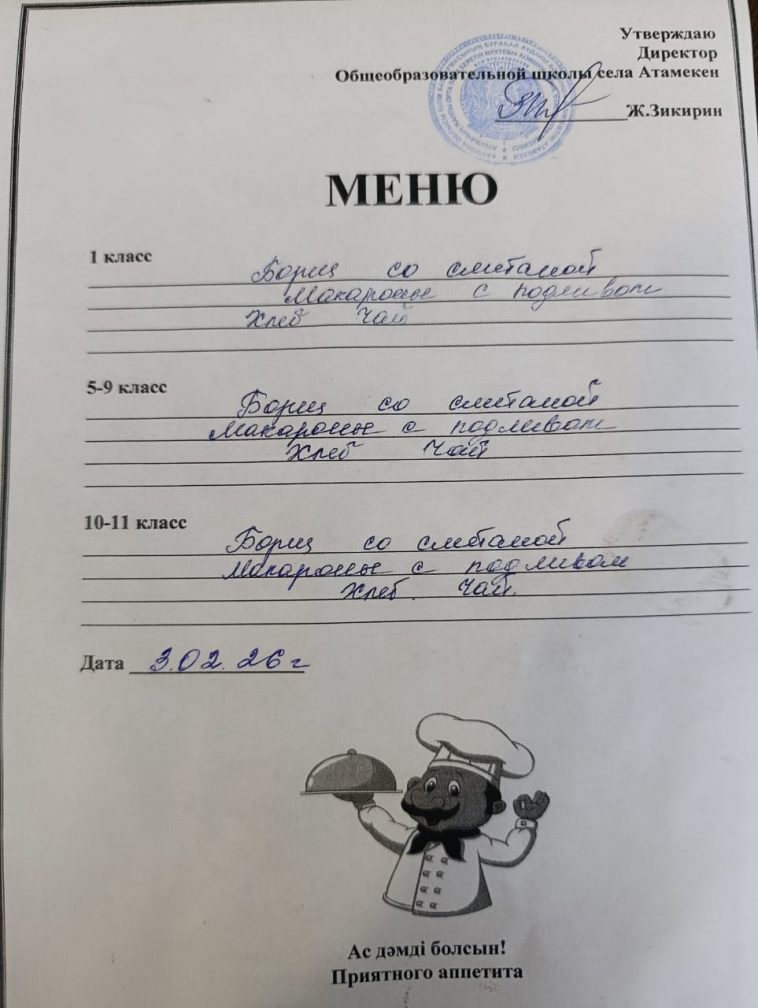03.02.2026 жылға арналған мәзір