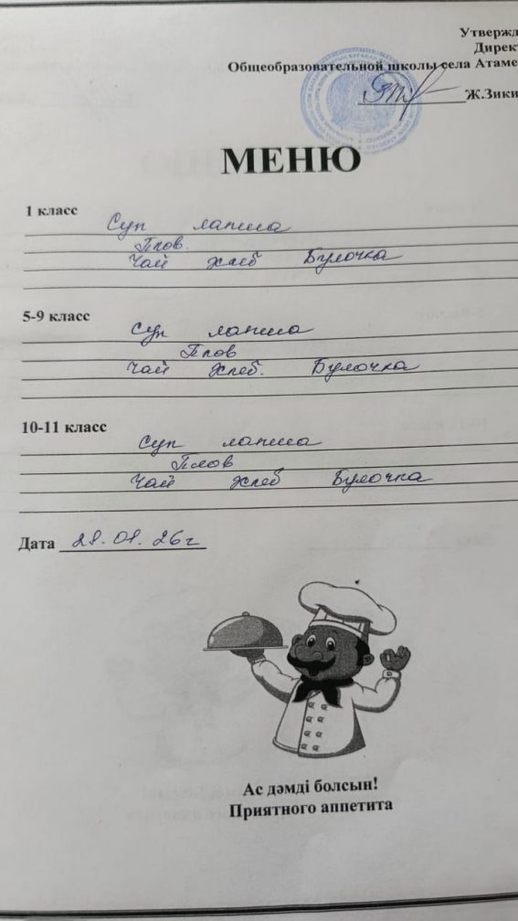 28.01.2026 жылға арналған мәзір