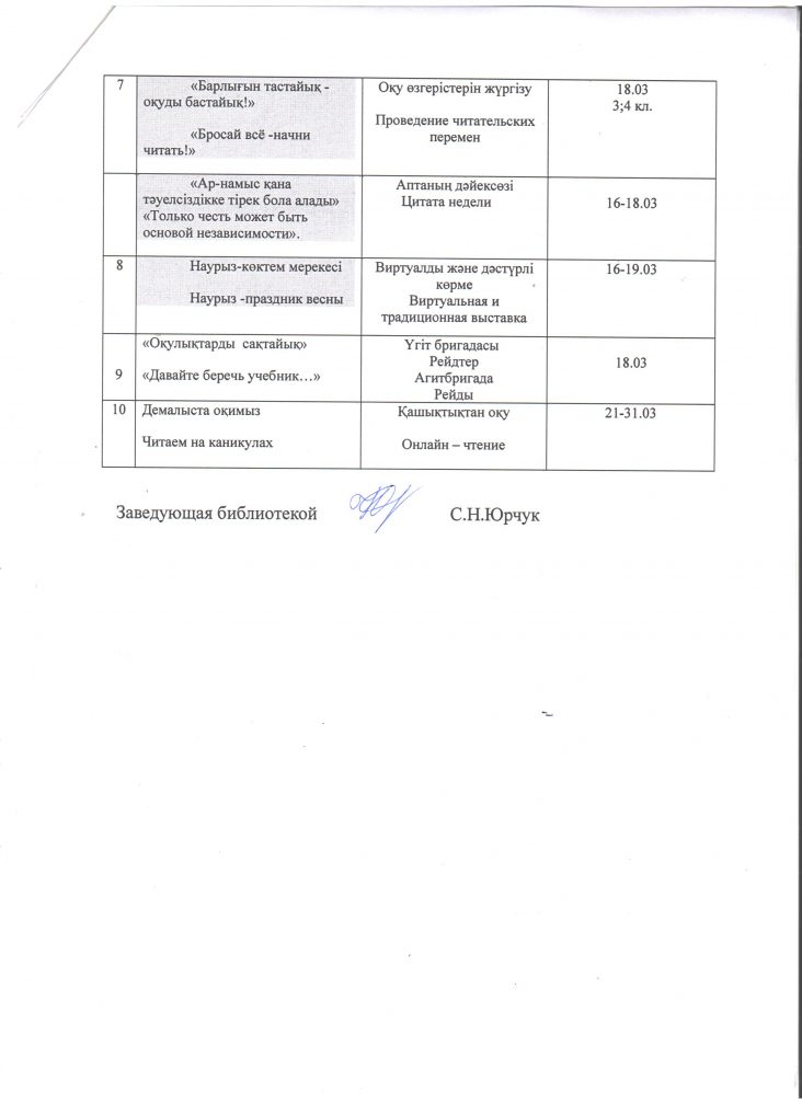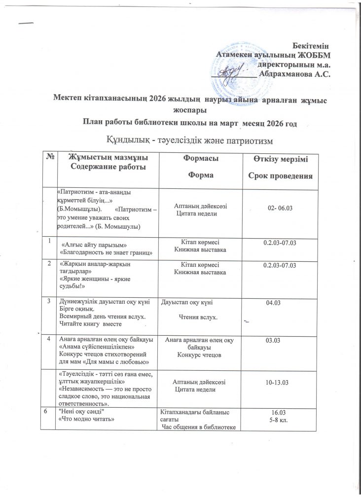 Мектеп кітапханасының 2026 жылдың наурыз айына арналған жұмыс жоспары