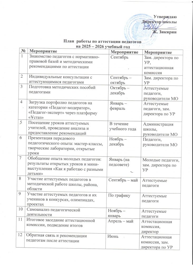 2025-2026 оқу жылына арналған педагогтерді аттестаттау жөніндегі жұмыс жоспары